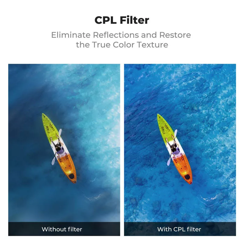 A K&F Concept CPL (polárszűrő) hatékony eszköz például horgászathoz, síeléshez, építészeti fotózáshoz és más kültéri felhasználáshoz. Csökkenti a nem fémes felületekről – például vízről vagy üvegről – visszaverődő tükröződéseket, így nagyobb hasznos dinamikatartományt és részletgazdagabb képet eredményez. Egyben fokozza a színtelítettséget és a kontrasztot, mélyebb, teltebb látványvilágot biztosítva.
