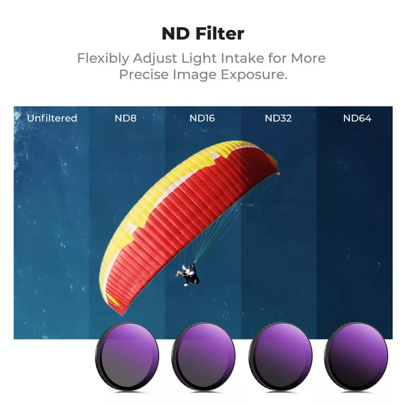 Az ND8, ND16, ND32 és ND64 szűrők 3–6 fényértékkel csökkentik a beérkező fény mennyiségét, így erős napsütéses környezetben is kontrollált expozíciót biztosítanak, miközben természetes módon megőrzik a képrészleteket. Egyenletesen mérséklik az akciókamera szenzorára jutó fényt dinamikus kültéri helyzetekben, megelőzve a túlexponálást, és lehetővé téve a filmszerű mozgáselmosás (motion blur) hatás elérését.