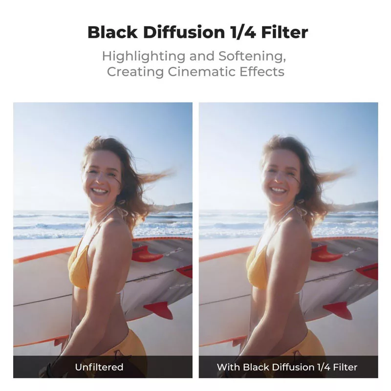 A Black Diffusion 1/4 szűrő lágyítja a bőr textúráját, finomítja a ráncok, szeplők és pórusok megjelenését, természetesebb, esztétikusabb portréhatást eredményezve. A finom ködösítés révén filmszerű, álomszerű képi világ érhető el.