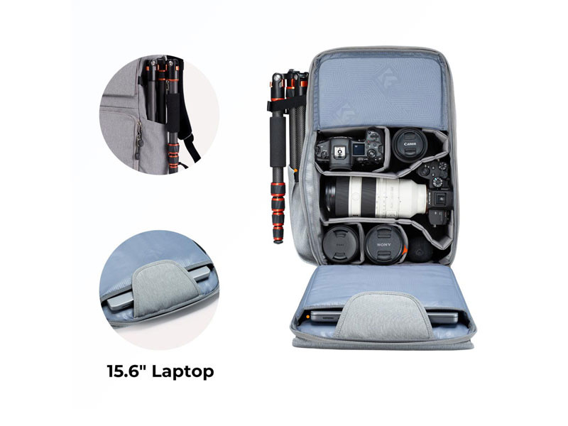 Ennek a nagy kapacitású fényképezőgép-hátizsáknak a fő teste mindennapi rekeszekre, fényképezőgép-felszerelés rekeszekre és számítógépes rekeszekre van osztva, ésszerűen megszervezve a személyes holmikat és a fényképezőgép-felszerelést. Emellett van egy külön rekesz egy 15,6"-os laptop számára is.