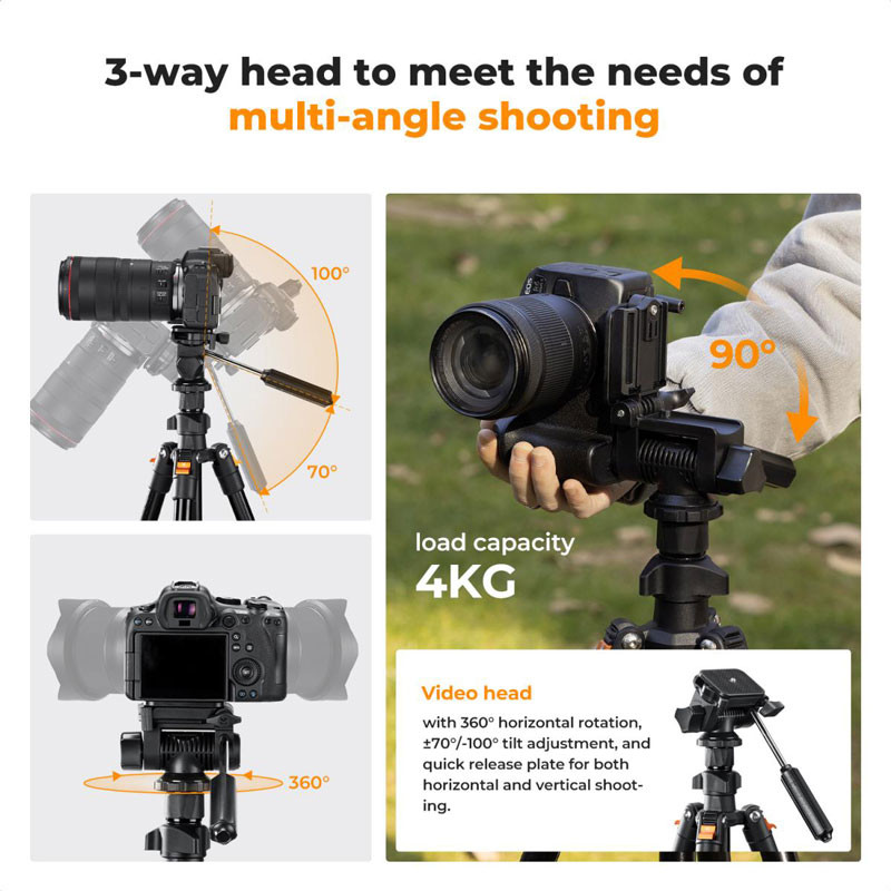 Az állvány maximális terhelhetősége 4 kg, 360°-os vízszintes forgathatósággal és -70°-tól +100°-ig terjedő dőlésszöggel rendelkezik. Az állvány gyorskioldó lemeze vízszintesen és függőlegesen egyaránt használható többszögű felvételek készítéséhez.