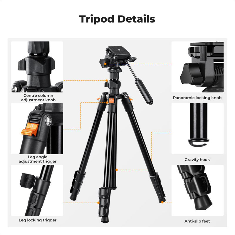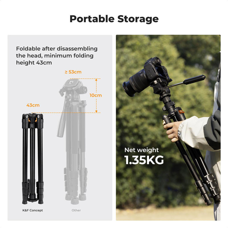 A háromlábú állvány ötvözi a funkciónalitást és a hordozhatóságot, 4 részes lábakkal, maximális magassága 196 cm. A fej leszerelése után az állvány összecsukható, összecsukott mérete mindössze 43 cm, így könnyen tárolható hátizsákban vagy fényképezőgép táskában.