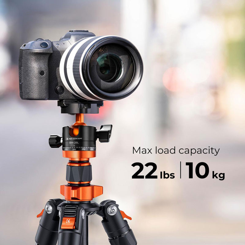 A állvány súlya 1,52 kg. A 28 mm-es KF-28 fém gömbfej 10 kg teherbírással rendelkezik, 360 fokban forgatható, így panorámaképek készítésekor bővíti a DSLR fényképezőgép mozgásterét.