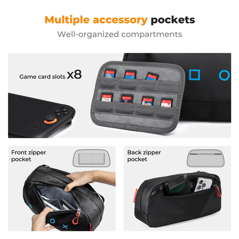 A fő rekesz mellett a Nintendo Switch 2-hez készült válltáskánk számos kiegészítő zsebbel is rendelkezik. Az elülső zsebekben elemek és egyéb kiegészítők tárolhatók, a hátsó rejtett zsebben pedig értéktárgyak, például pénztárca vagy telefon. A kivehető játék kártyatartó 8 játék kártyát képes tárolni. A tápkábel-tartó kifejezetten kábelek tárolására lett kialakítva, így azok rendezettebbek és tisztábbak maradnak.