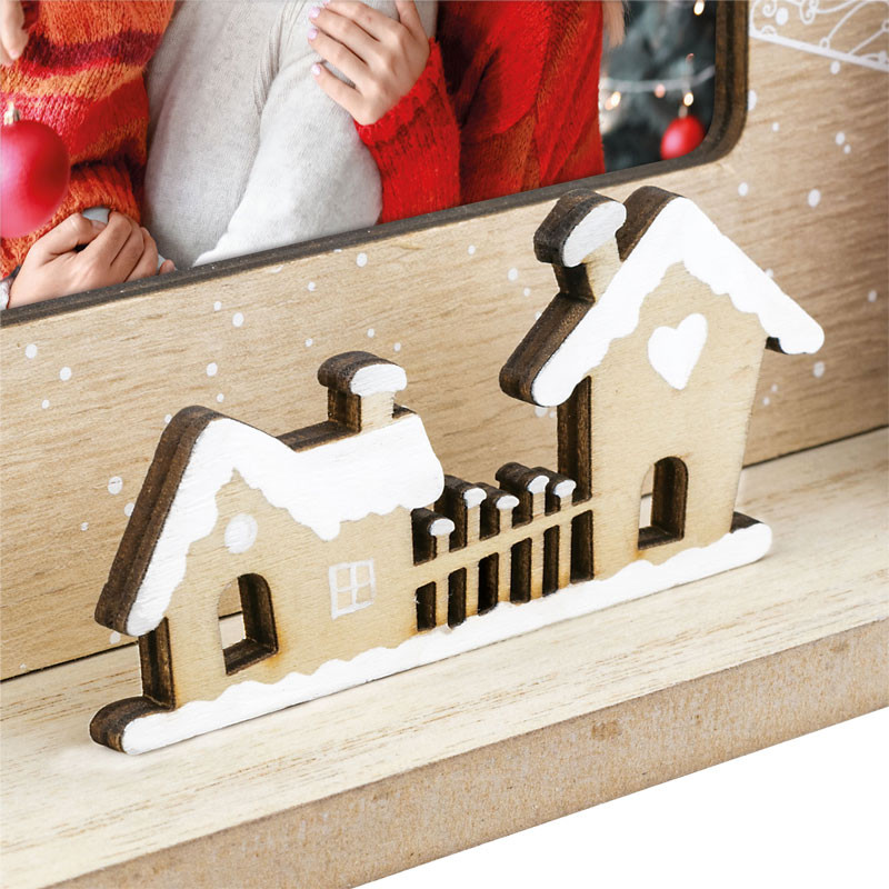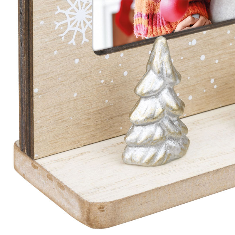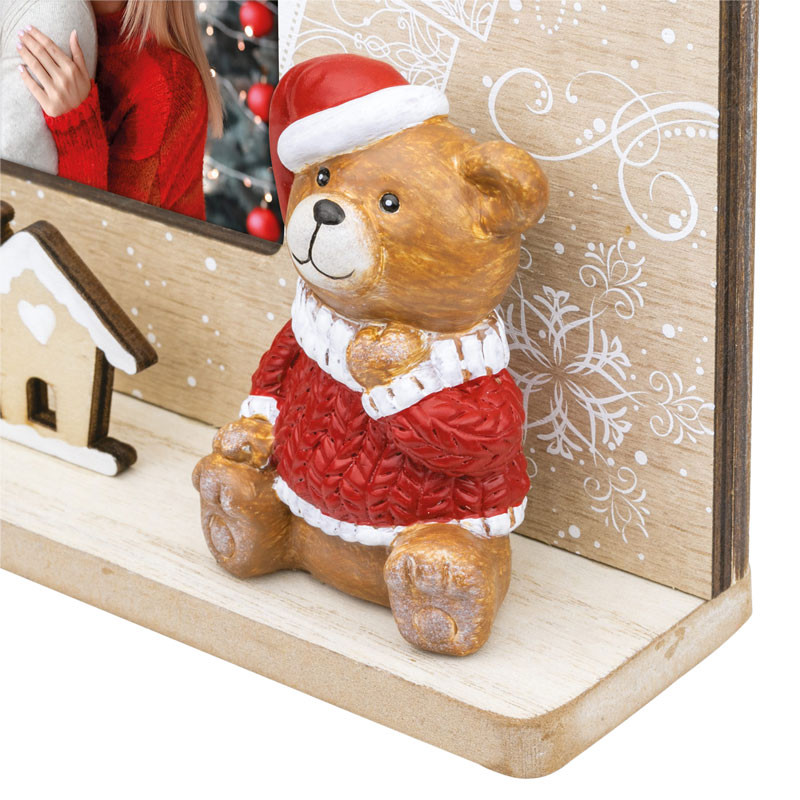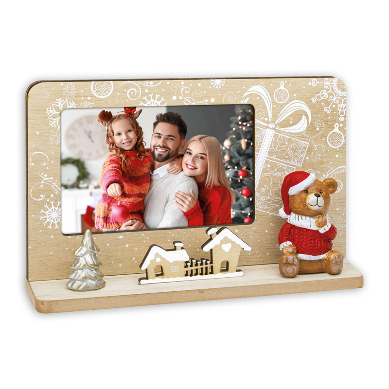 This charming, festive wooden picture frame is the perfect addition to your Christmas decorations. The natural wood-effect background is decorated with snowflakes and gift box patterns, creating a warm, cozy atmosphere. The lower decorative strip features small wooden houses and a silver Christmas tree, while on the right-hand side, a cute teddy bear wearing a Santa hat adds to the charm of the composition.