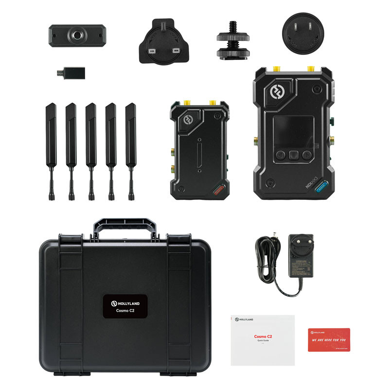 The Cosmo C2 HDMI/SDI Wireless Video 1-Transmitter System from Hollyland allows you to wirelessly transmit high-resolution video up to 1080p60 over long distances up to 914 meters using two transmitters to a single receiver, allowing flexible video monitoring and distribution for your studio or field production. This kit comprises two transmitters and a receiver that communicate over the 5.1 to 5.85 GHz wireless frequency range. Additional improvements to the series include HEVO 2.0 technology, UVC/RTMP/NDI|HX streaming support, and expanded power options.