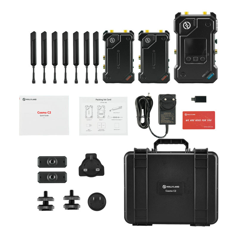 The Cosmo C2 HDMI/SDI Wireless Video 2-Transmitter System from Hollyland allows you to wirelessly transmit high-resolution video up to 1080p60 over long distances up to 914 meters using two transmitters to a single receiver, allowing flexible video monitoring and distribution for your studio or field production. This kit comprises two transmitters and a receiver that communicate over the 5.1 to 5.85 GHz wireless frequency range. Additional improvements to the series include HEVO 2.0 technology, UVC/RTMP/NDI|HX streaming support, and expanded power options.