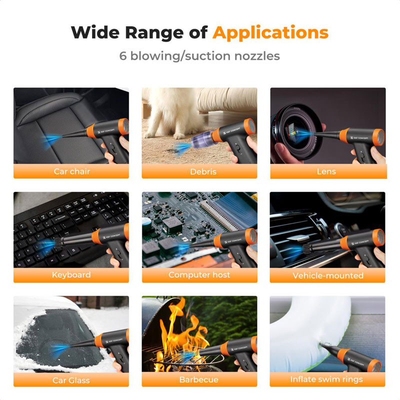 Compressed air comes with 6 sets of nozzles/ brush and 5 vacuum cleaning cloth, which can meet all kinds of cleaning demand, laptops, car interiors, seats, and can also be used for outdoor picnics to blow fires, dry the hair of people and pets, Inflatable swimming rings and remove snow and leaves from the surface of the car, etc.