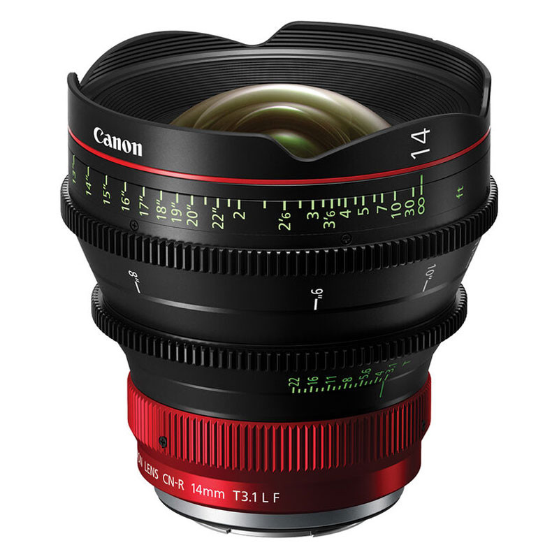 Suited for full-frame cinema cameras with RF lens mount compatibility, the Canon CN-R 14mm T3.1 L F Cinema Prime Lens renders crisp images with rich contrast. An 11-blade iris and maximum T3.1 aperture make for a natural bokeh effect with a wide depth of field and smooth image falloff. A consistent warm color balance ensures natural color reproduction particularly suited for skin tone capture. The dual-pixel focus guide reduces focus breathing while providing framing stability. Lens markings are displayed in feet, and the focus ring rotates 300° for precision.