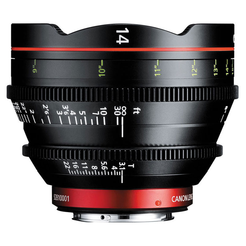 The CN-E 14mm and the other five CN-E lenses share the same 114m front barrel diameter, focus rotation, 36° iris rotation, and focus and iris gear positions, allowing for easier lens swaps.