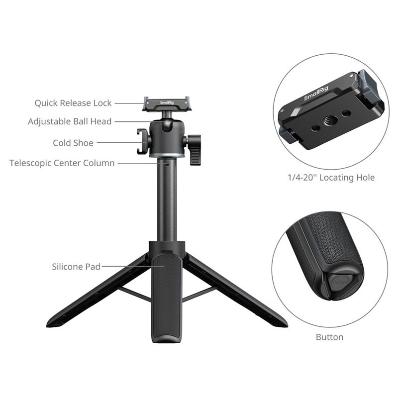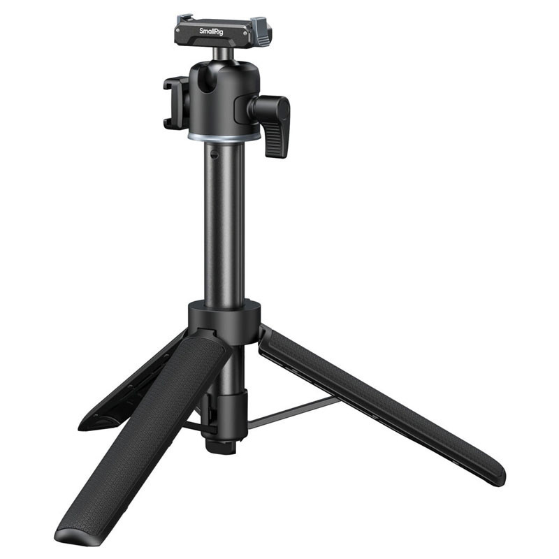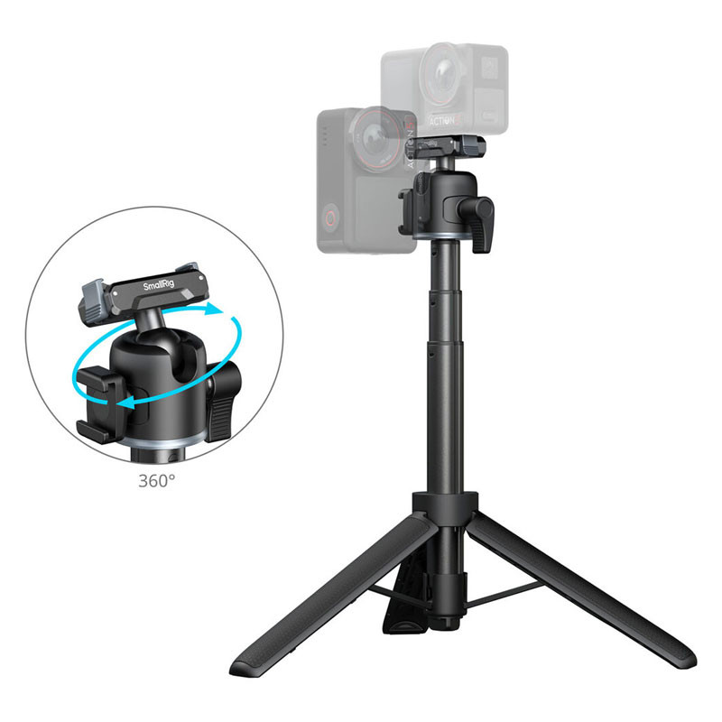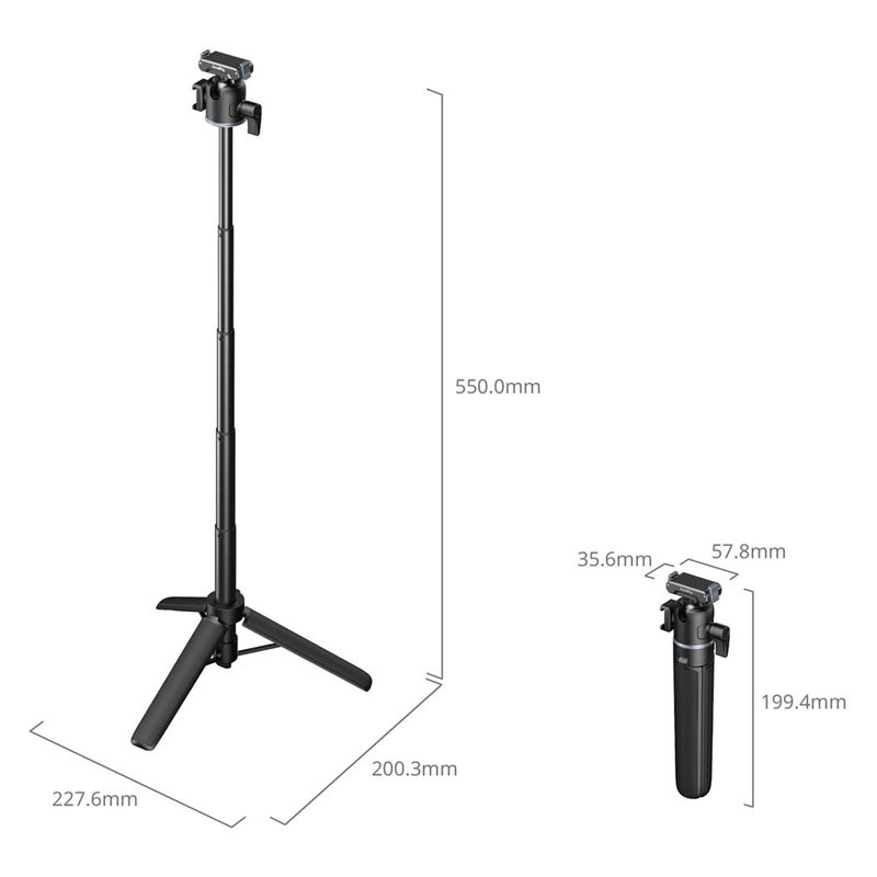 The Telescoping Handgrip/Tripod by SmallRig provides a lightweight tripod that features a 20 to 55 cm telescoping pole, a collapsible mini tripod, an adjustable ball head, and a quick release action camera clamp mount. The tripod can support small action cameras such as GoPro HERO and DJI Action series, supporting loads up to 499 grams. The camera mounts onto the head using a 1/4"-20 screw or using the action camera quick release clamp.