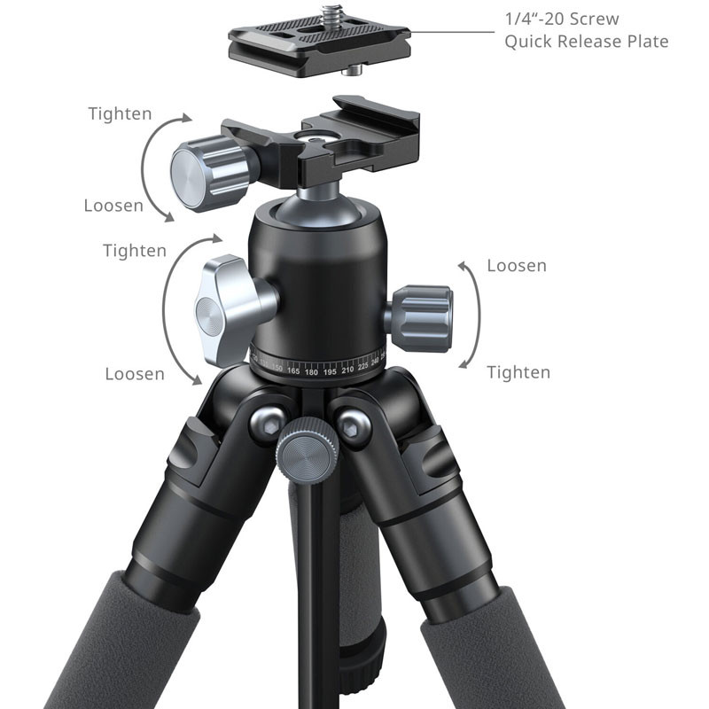 Built for durability, the tripod's aluminum alloy legs support a payload of up to 5 kg, while the head can manage 3 kg. For accurate positioning, the tripod features three knobs that can be easily loosened or tightened to make precise adjustments. The accompanying Arca-Type quick-release plate features a 1/4"-20 screw for attaching cameras and expanding with accessories, and the tripod base has a 3/8"-16 screw to ensure compatibility with a wide array of equipment. A built-in bubble level helps ensure your shots are properly aligned every time. Additionally, the tripod comes with a smartphone mount and carry case, making it the perfect all-in-one choice for vlogging and mobile content creation.