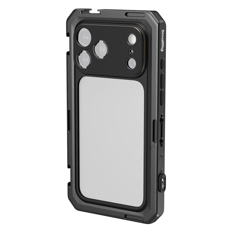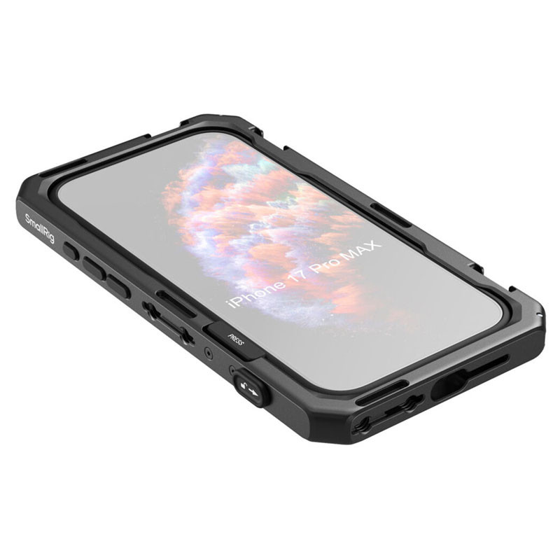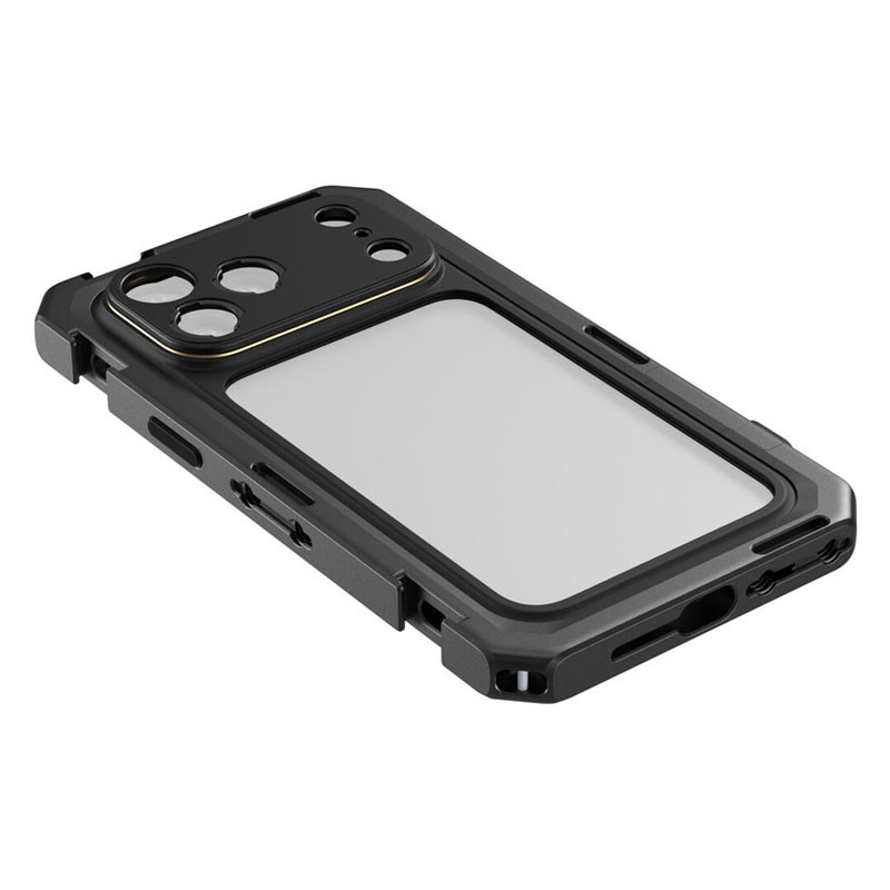 Designed for the iPhone 17 Pro, the Mobile Video Cage Basic Edition from SmallRig is a professional expansion solution for videography, live streaming, and more. Built using metal, it provides shock absorption and scratch resistance. Included is a TPU soft bumper case, a T-mount lens backplate, and a 17mm lens backplate.