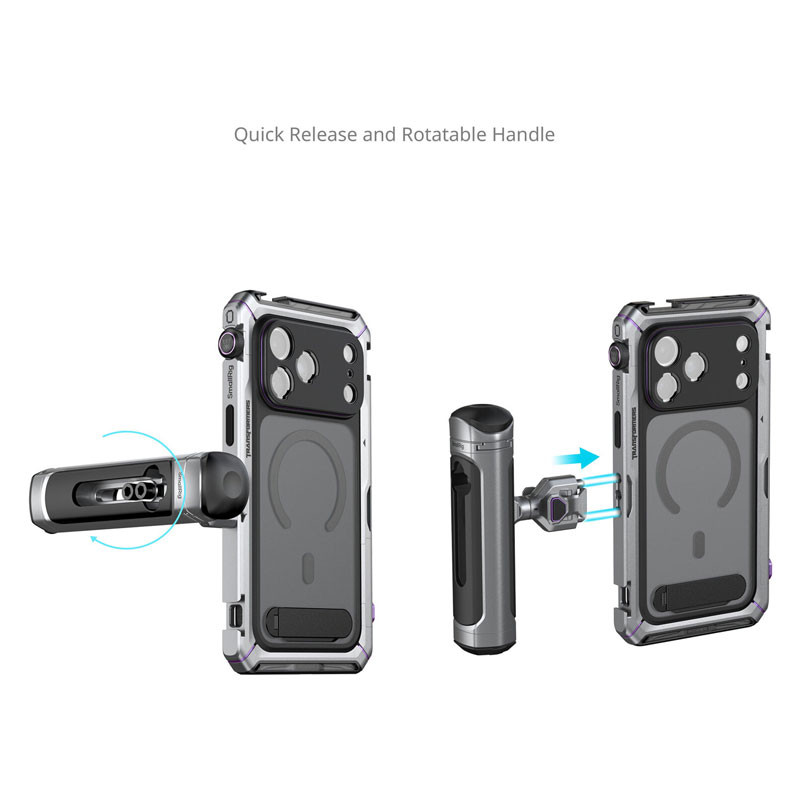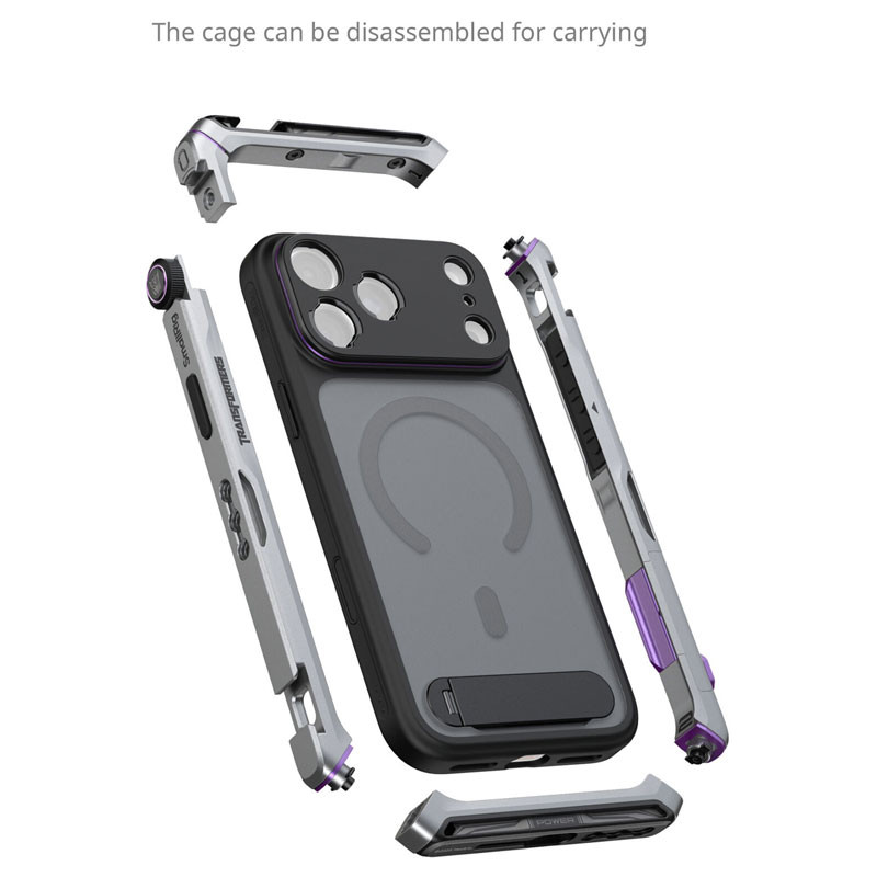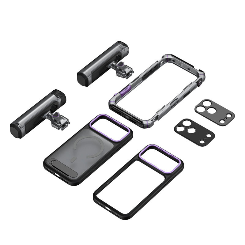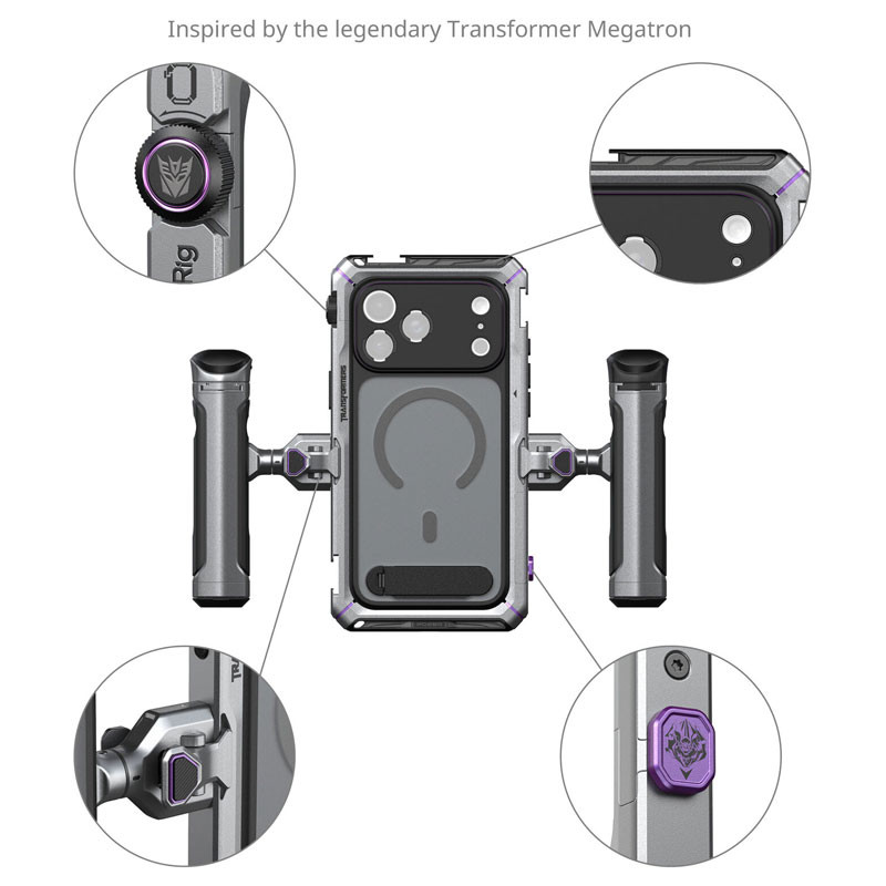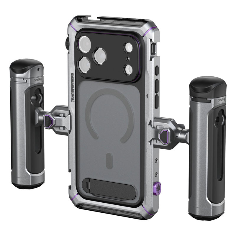 Designed for the iPhone 17 Pro Max, the Mobile Dual Handheld Kit from SmallRig is a professional shooting solution for high-end video recording, live streaming, and more. It features a Transformer-themed insignia with a gray and purple color scheme. This kit includes a phone cage, a phone case, a TPU soft bumper, a rotatable side handle with wireless control, a rotatable side handle, a T-mount lens backplate, and a 17mm lens backplate.