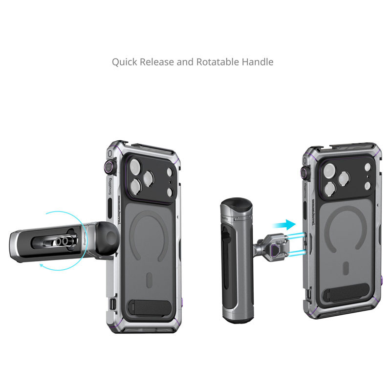 Built using metal, the cage provides shock absorption and scratch resistance. Your phone may be mounted in the cage with or without the case on, and the cage also features multiple 1/4"-20 anti-twist threaded holes and cold shoe mounts for attaching accessories that include handles, tripods, microphones, and lights. Furthermore, quick release interfaces allow for user-friendly handheld or tripod setups, while a quick-lock mechanism keeps your phone secure by preventing accidental unlocking and phone ejection. For underwater shooting or high-performance cooling scenarios, the phone can be used without the case by mounting it directly into the cage alongside the TPU soft bumper.