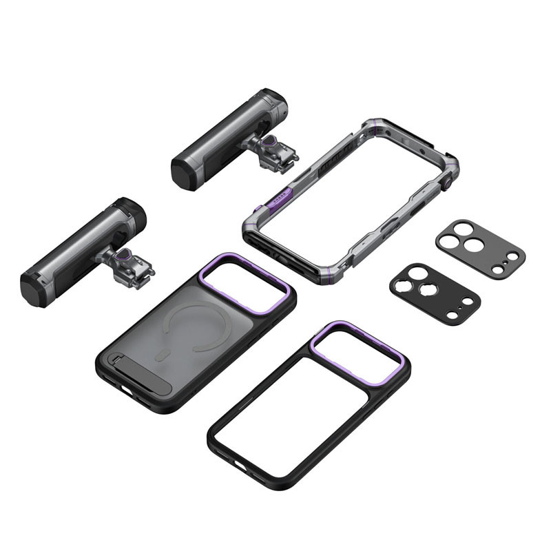 Designed for the iPhone 17 Pro, the Mobile Dual Handheld Kit from SmallRig is a professional shooting solution for high-end video recording, live streaming, and more. It features a Transformer-themed insignia with a gray and purple color scheme. This kit includes a phone cage, a phone case, a TPU soft bumper, a rotatable side handle with wireless control, a rotatable side handle, a T-mount lens backplate, and a 17mm lens backplate.