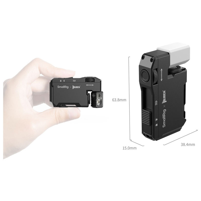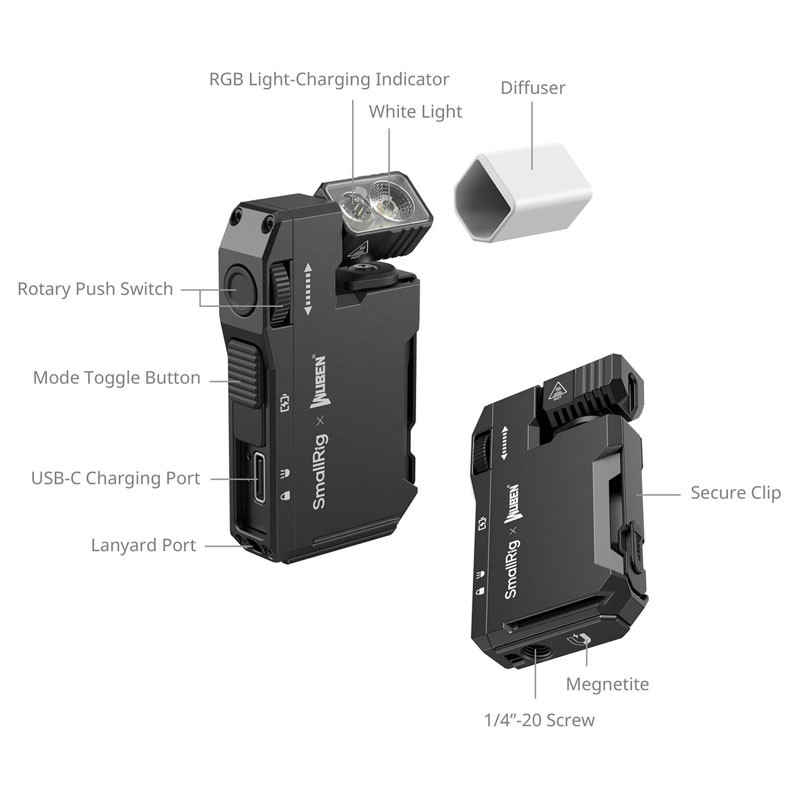 Bright white light, seven colors with beacon and strobe settings, and hands-free capability—this all-in-one compact Thumb EDC Flashlight from SmallRig offers stepless adjustments of white-light brightness on a rotary dial. Click a button and the same dial selects red, orange, yellow, green, cyan, blue, or purple. You can also activate beacons and flashing modes in multiple color combinations. Size to fit in your pocket on the included key chain, this under-2-ounce Thumb has a magnetized base, a 1/4"-20 tripod-style socket, and an adjustable clip for hands-free use. Its 450mAh battery charges via USB-C and will run for up to 50 minutes on the maximum power setting and up to 65 days on low.