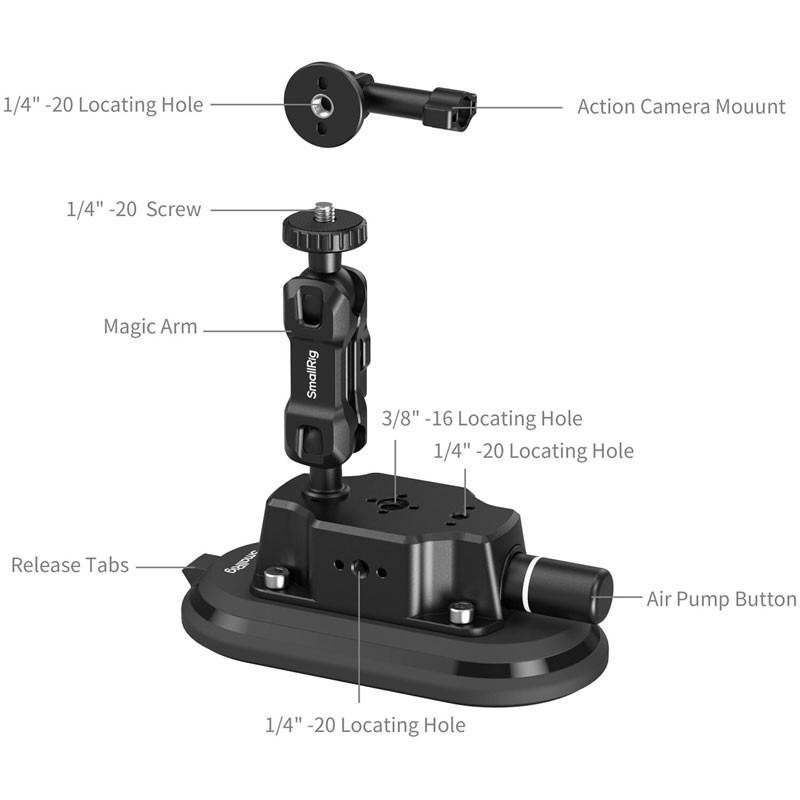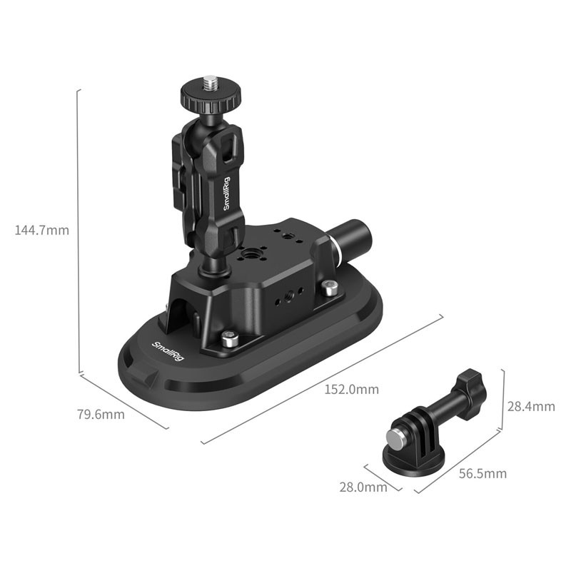 SmallRig 7.6 × 15 cm Car Suction Support for Action Cameras 5842 consists of three components: an oval suction cup, a magic arm, and an action camera mount. Crafted from durable rubber, the suction cup offers robust wear resistance and excellent sealing performance across extreme temperatures (-20°C to 60°C). Its oval shape conforms better to curved vehicle surfaces than traditional round suction cups and is designed for clean, dry, flat surfaces.