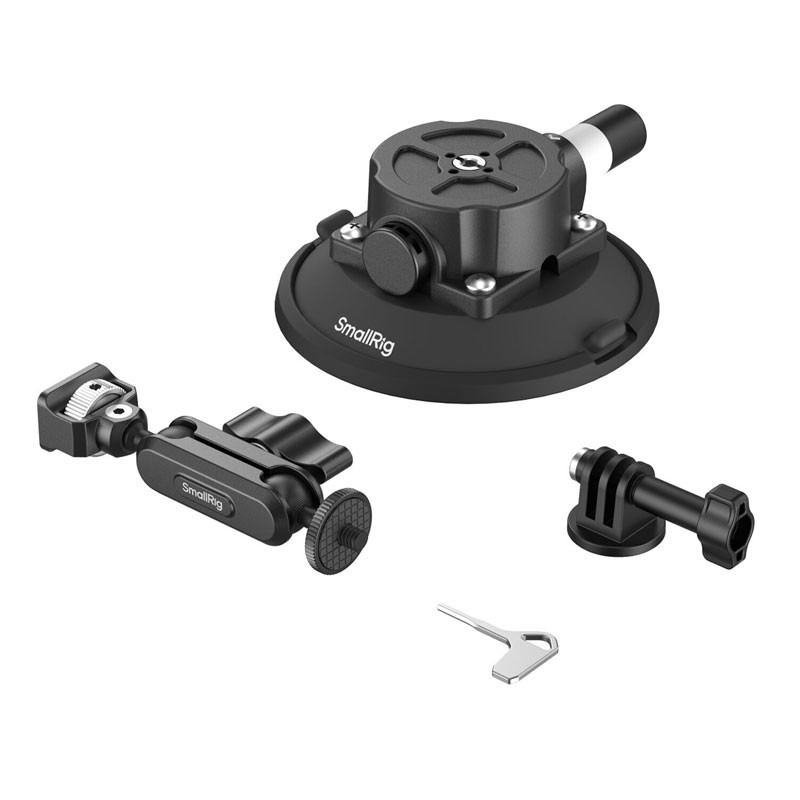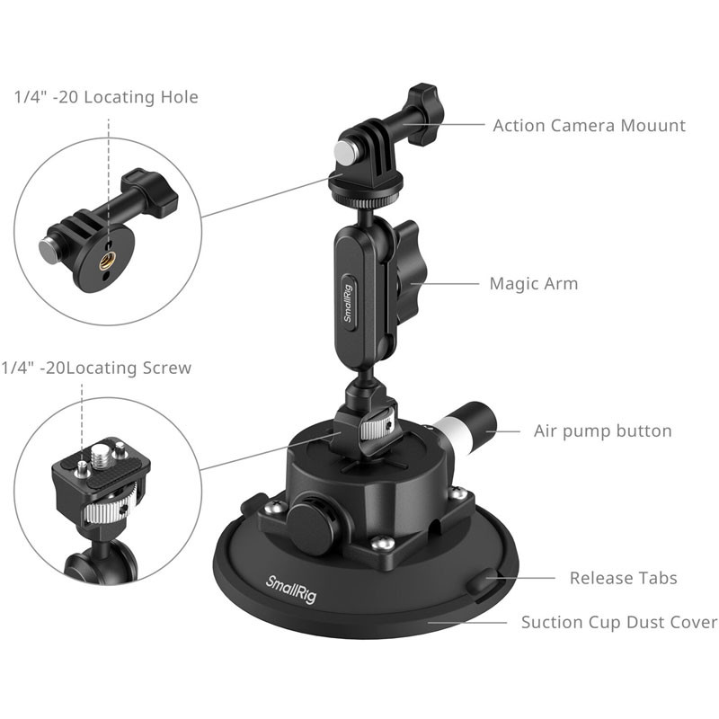Create a secure seal on flat surfaces or vehicles for dynamic shooting scenarios with the Suction Cup Mount from SmallRig. The suction cup measures 11cm in diameter and attaches to surfaces via one-touch mounting. An included magic arm with ball heads secures to the suction cup and the included 3-prong mount adapter while allowing you to adjust the positioning of your camera. The rubber construction of the cup maintains your seal even in extreme temperatures from -20°C to 60°C. The entire configuration supports accessory configurations up to 1.5 kg. Use the dust cover to maintain the lifespan of the suction cup.