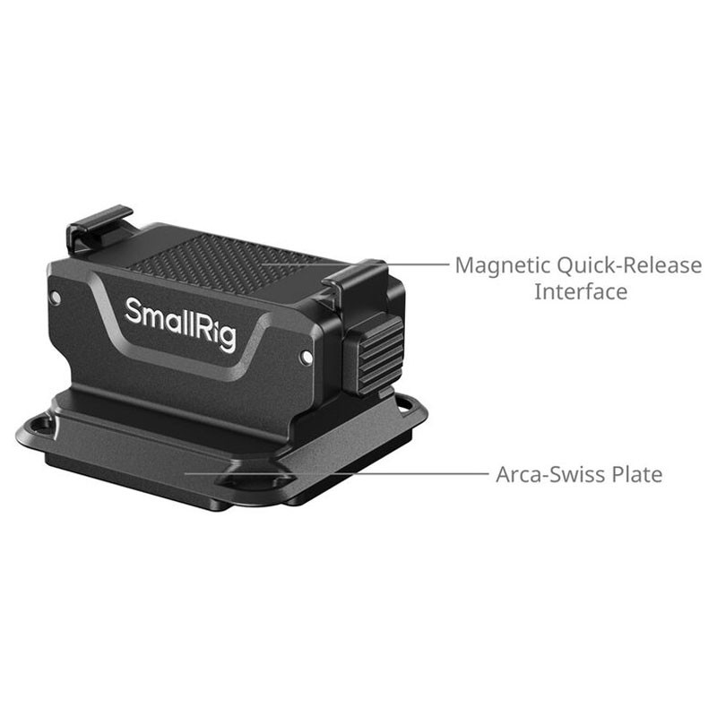 The Bidirectional Attachable Mount to Arca-Swiss Adapter from SmallRig is designed for use with DJI Osmo Series camera models like the Action 6 and Nano, offering a magnetic metal quick release Arca-type adapter for enhanced technical and creative flexibility. The bidirectional magnetic quick release mount on top facilitates quick and reliable attachment and detachment of any compatible camera, while the universal Arca-Swiss standard used on the bottom enables easy mounting to select backpack clips and Arca-compatible tripods, for instant switching among handheld, tripod, and clipped setups.