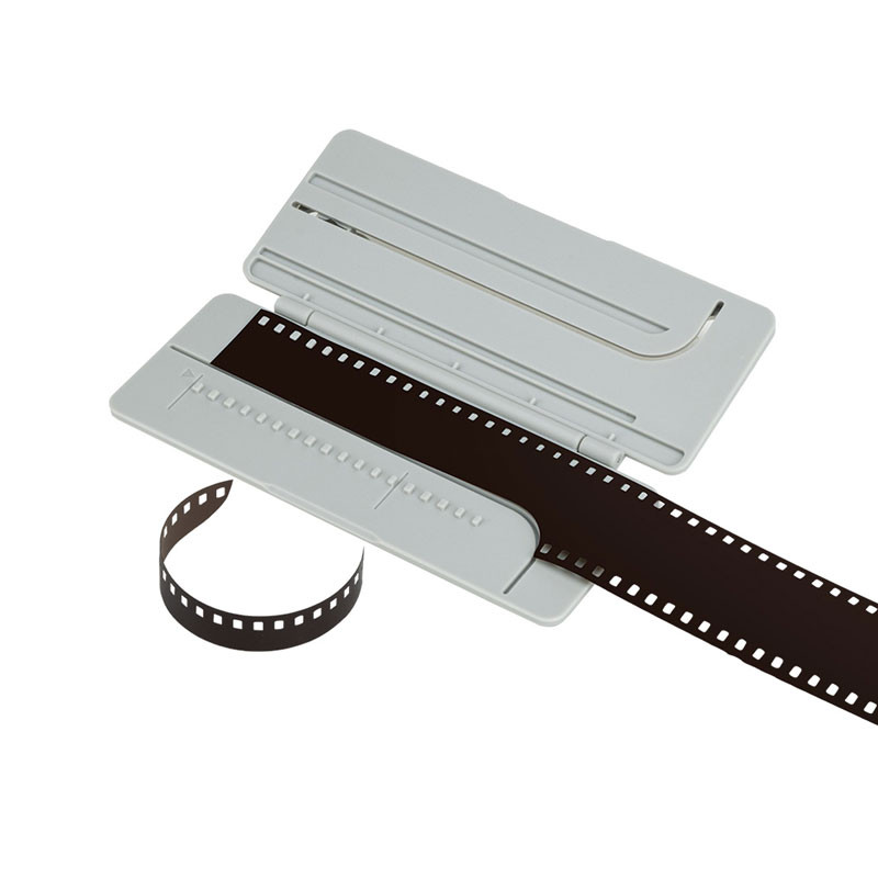 The cutter body is made of durable ABS material and features a dual-locking design. The film perforations on both sides are first aligned with the positioning posts, then securely clamped by the top cover to prevent slipping and ensure neat, accurate cuts. Silicone anti-slip pads on the bottom keep the cutter steady on desks or metal surfaces, further enhancing cutting precision. Compact and portable, it easily fits into a pocket or camera bag for convenient use anywhere.