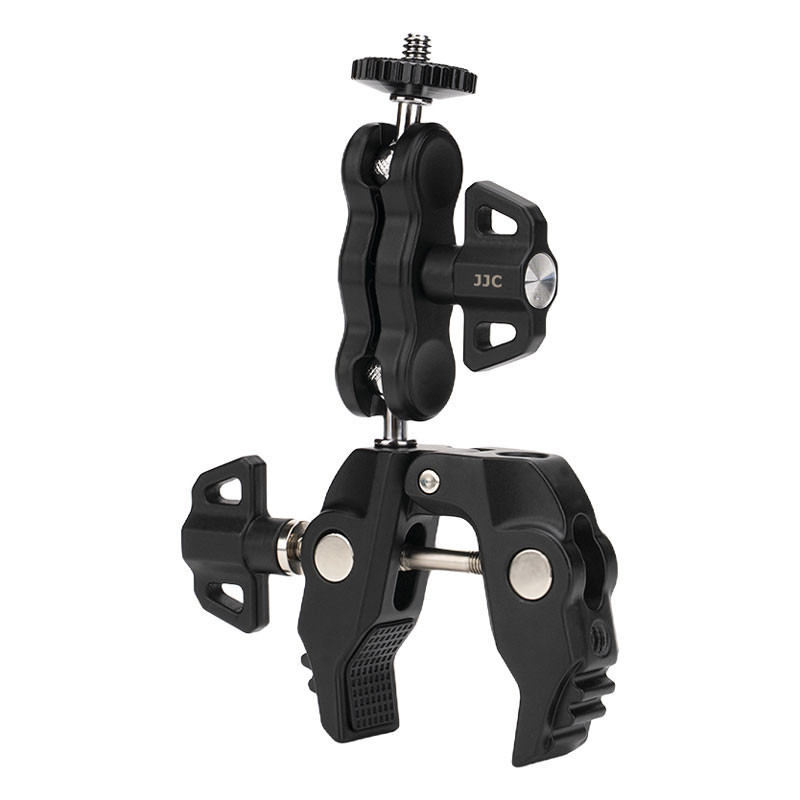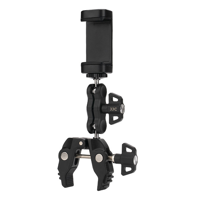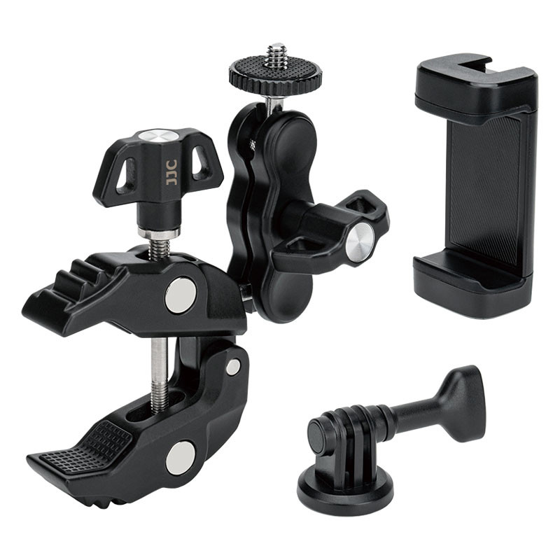 JJC MFC-K1 Multi-Function Power Clip Kit is a universal all-scenario support system designed for most cameras, smartphones, and action cameras. It securely mounts your device onto desktops, stands, railings, light stands, tubes, and other surfaces with a thickness of 12–60 mm, meeting a wide range of needs such as live streaming, outdoor shooting, desktop lighting, travel recording, and action photography. The main body is constructed from premium aluminum alloy for long-lasting durability. The kit includes one multi-function power clip, one multi-function bean pod, one phone holder, and one action camera tripod adapter. The multi-function power clip and multi-function bean pod come pre-assembled from the factory and can be detached or repositioned as needed. All components can be freely combined to build a flexible and efficient mounting system that supports multiple devices across various shooting scenarios.