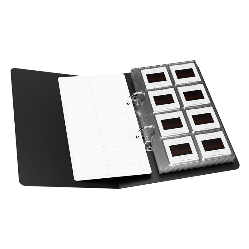 The album features a box-style design for easy sliding in and out. Made of durable black PP, it is wear-resistant and provides dustproof, moisture-proof, and mildew-proof protection. It also effectively blocks light exposure, reducing the risk of film fading and extending the lifespan of your images.The album uses a metal ring binding for smooth opening and closing, allowing pages to be easily added or removed. It includes 12 transparent PP pages, each capable of holding 8 slide mounts. The individual-slot design keeps each film separate, minimizing contact, abrasion, and potential damage.