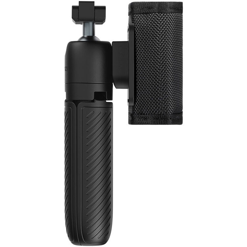 The compact tripod measures 15 cm in length when folded, and can be used as a handgrip for the camera. The extension arm extends up to 27 cm to obtain additional handheld angles. A hook-and-loop strap is included to mount the camera on any strap measuring 6 cm to 7.8 cm wide and 1 cm thick. The tripod snaps into the mount and has a maximum load capacity of 998 grams.