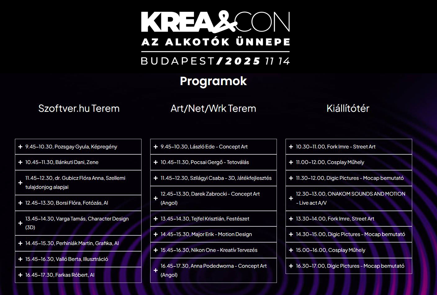 Ez csak ízelítő a gazdag programból – a KreaCon számos további előadója, illusztrátor, concept artist, animátor, grafikus és vizuális alkotó is megosztja tapasztalatait.
