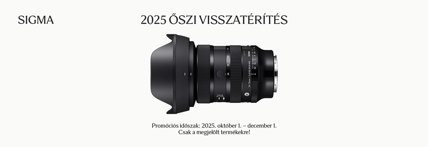 Vásárold meg a pénzvisszatérítési akcióban szereplő Sigma objektívet 2025. október 1. és 2025. december 1. között a Fotoplus-nál! A webáruházban feltüntetett árak nem tartalmazzák a pénzvisszatérítés összegét – azt a Sigma utalja vissza a bankszámládra. Fontos: A vásárlás dátumának mindig a megrendelés leadásának napja számít. Ha a promóció végén adod le a rendelést, de a termék csak később érkezik (pl. készlethiány miatt), a számlán mi feltüntetjük a megrendelés dátumát – így jogosult maradsz a pénzvisszatérítésre. Az érvényes Fotoplus számla kötelező, rendelés-visszaigazolás önmagában nem elegendő.