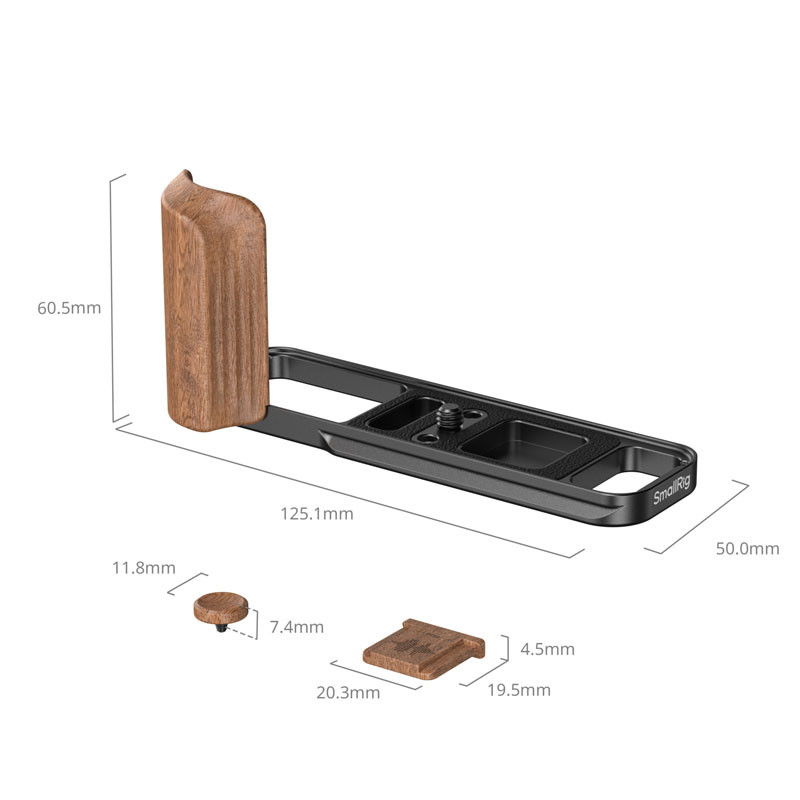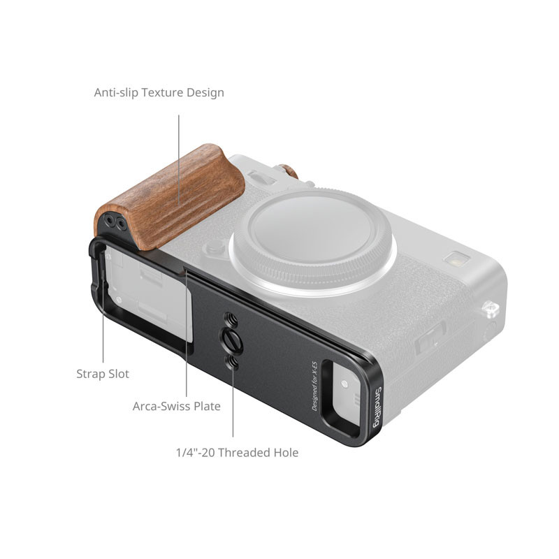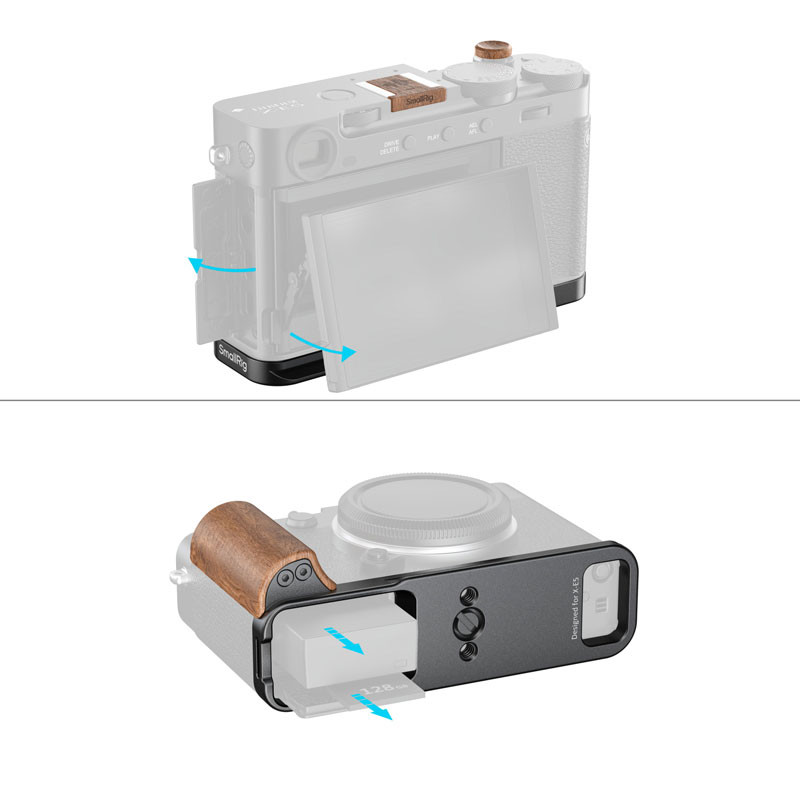 A kompakt L-alakú kialakítás mellett minden fontos csatlakozó és funkció szabadon elérhető marad, beleértve az akkumulátorrekeszt, a memóriakártya-foglalatot, a hangszórót és a Bluetooth gombot is. A csomag része egy fa kioldógomb és egy vakupapucs fedél, amelyek javítják a kioldás érzetét és tovább erősítik a klasszikus megjelenést.