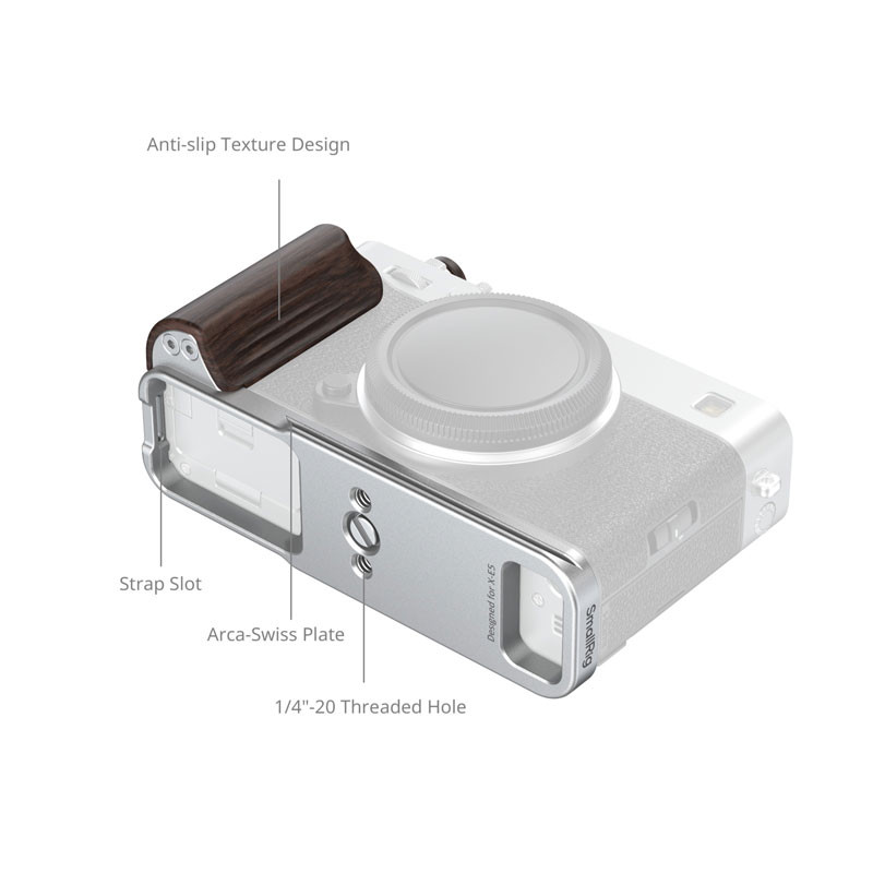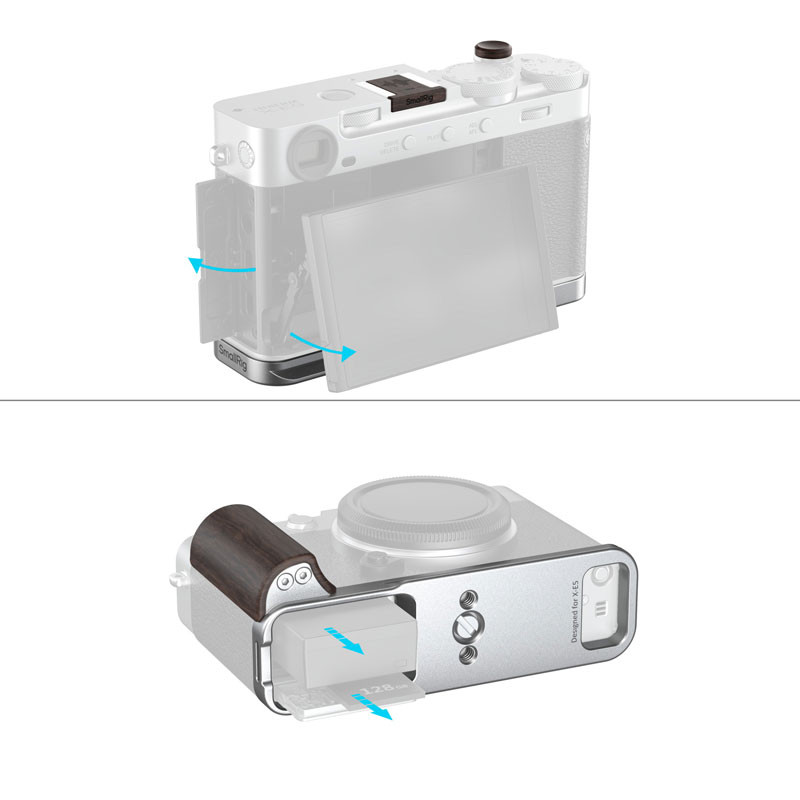 A kompakt L-alakú kialakítás mellett minden fontos csatlakozó és funkció szabadon elérhető marad, beleértve az akkumulátorrekeszt, a memóriakártya-foglalatot, a hangszórót és a Bluetooth gombot is. A csomag része egy fa kioldógomb és egy vakupapucs fedél, amelyek javítják a kioldás érzetét és tovább erősítik a klasszikus megjelenést.