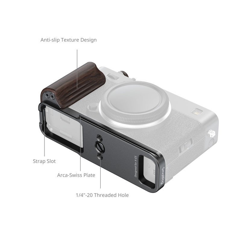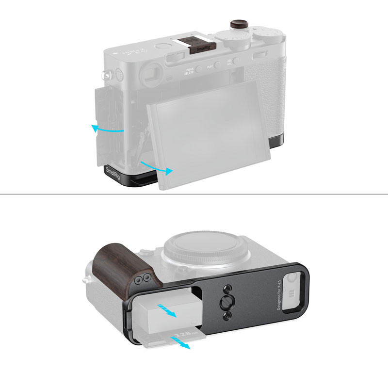 A kompakt L-alakú kialakítás mellett minden fontos csatlakozó és funkció szabadon elérhető marad, beleértve az akkumulátorrekeszt, a memóriakártya-foglalatot, a hangszórót és a Bluetooth gombot is. A csomag része egy fa kioldógomb és egy vakupapucs fedél, amelyek javítják a kioldás érzetét és tovább erősítik a klasszikus megjelenést.